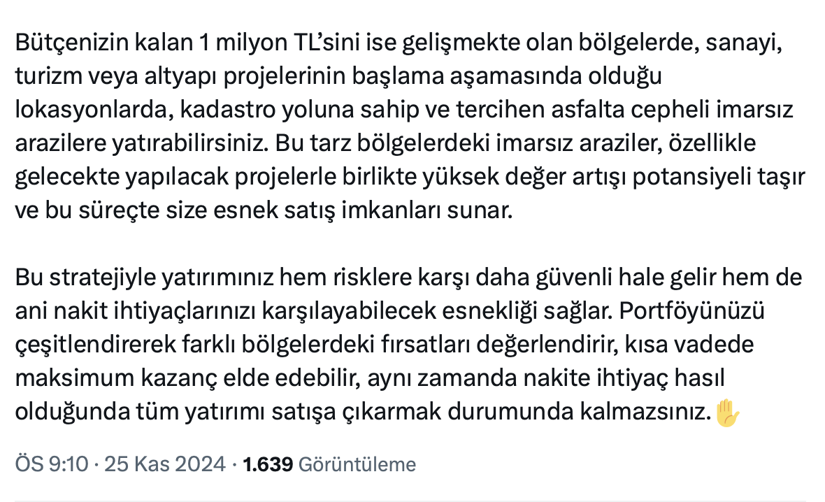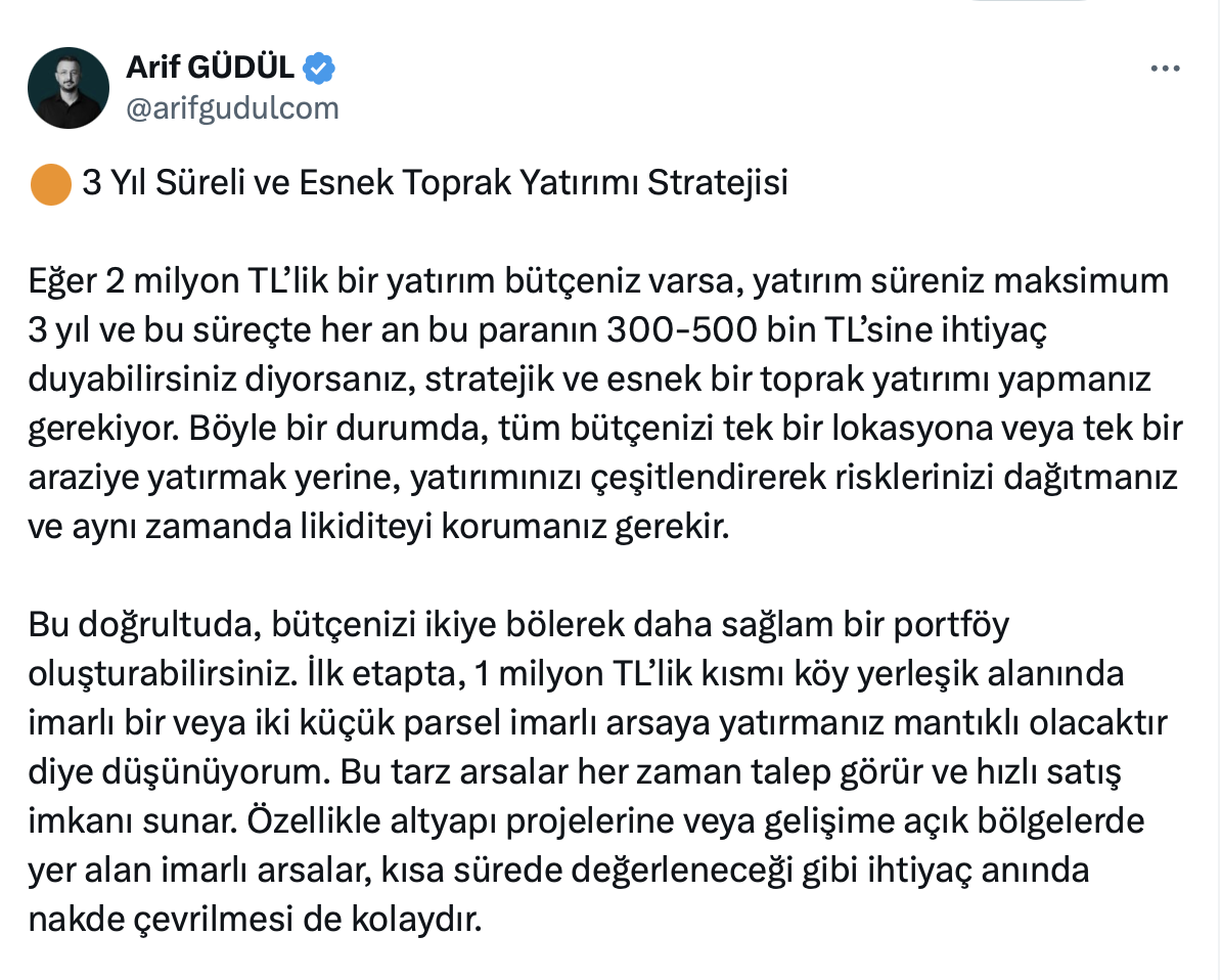 Arif Güdül resmi sosyal medya hesabı https://twitter.com/arifgudulcom üzerinden yaptığı paylaşımda 2 milyon TL ile 3 yıl süreli ve esnek toprak yatırımı stratejisini açıkladı.