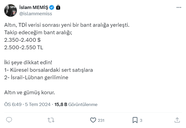 İslam Memiş bir başka paylaşımında gram altın için Temmuz ayı itibarıyla 2 bin 550 TL direncini takip edeceğini belirterek, Ağustos-Eylül aylarında da 2 bin 700 TL-3 bin -3 bin 500 TL aralığında yükseliş beklediğini söylemişti.