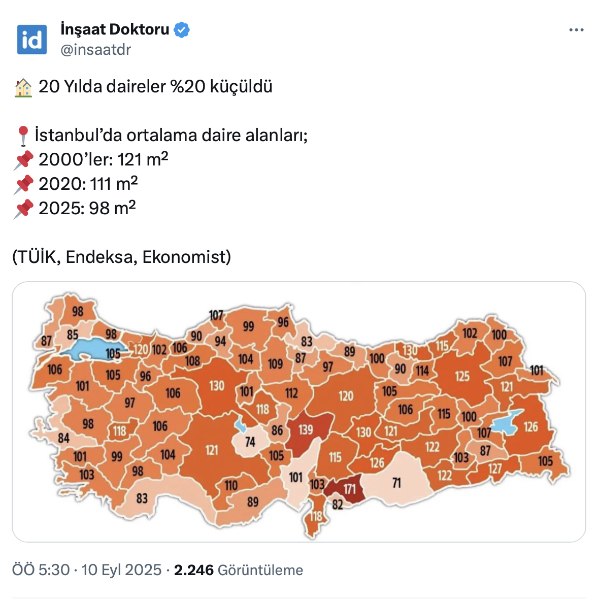 İnşaat Doktoru yaptığı paylaşımda 2000’li yıllarda 121 metrekare olan dairelerin, 2020’li yıllarda 111 metrekareye, 2025 yılında ise 98 metrekareye düştüğünü belirtti.