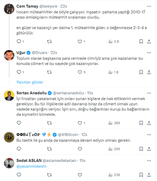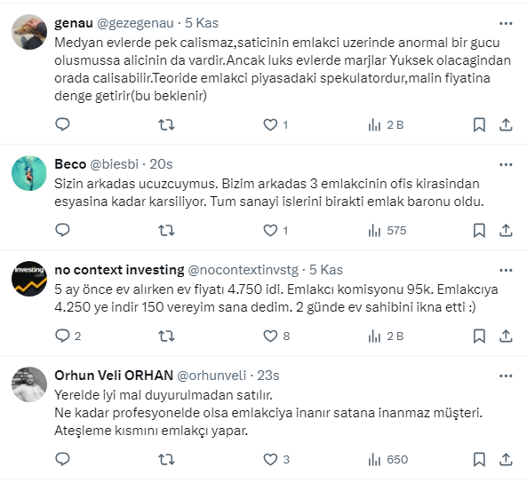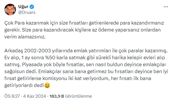 Arkadaş 2002-2003 yıllarında emlak yatırımları ile çok paralar kazanmış. Ev alıp, 1 ay sonra %50 karla satmak gibi sürekli harika kelepir evleri alıp satmış. Piyasada yok böyle fırsatlar, sen nasıl buldun deyince emlakçılar sağolsun dedi. Emlakçılar sana bana getirmez bu fırsatları deyince ben iyi fırsat getirirlerse komisyonu iki kat veriyordum, her fırsatı ilk bana getiriyorlardı dedi.