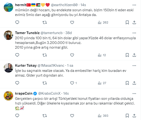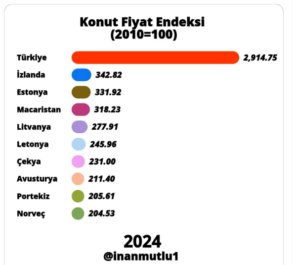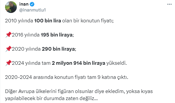 Son aylarda konut fiyatlarında reel anlamda düşüş yaşansa da, Türkiye’deki konut fiyat artışı Avrupa ve dünyanın birçok ülkesini geride bıraktı. Konut fiyatları son 14 yılda yaklaşık 30 katına çıktı. İktisatçı Akademisyen İnan Mutlu 2010 yılından beri konuttaki artış rakamlarını açıklayarak, bu rakamların Doğu Avrupa ülkeleriyle kıyaslanamaz durumda olduğunu söyledi. Mutlu İnan https://x.com/inanmutlu1 X sosyal medya hesabından yaptığı paylaşımda 2010 yılında 100 bin lira olan konutun şu an 2 milyon 914 bin liraya yükseldiğini söyledi. Sadece son 4 yılda ise konut fiyatlarının 9 kat arttığını ifade etti. 2020 yılında 290 bin TL olan konutun 2024’te ulaştığı rakamın 2 milyon 914 TL olduğuna dikkat çekti.