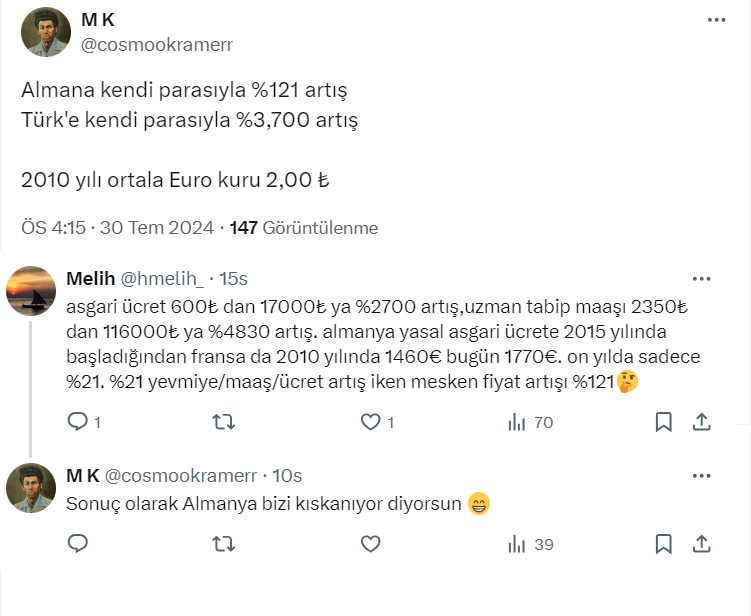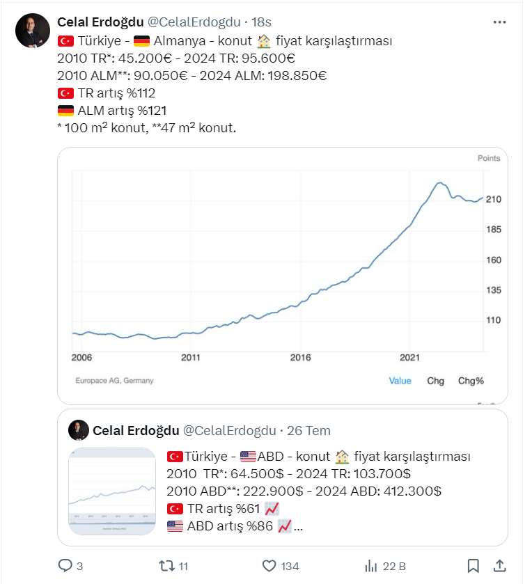 Şehir plancısı, Gayrimenkul Değerleme Uzmanı Celal Erdoğdu resmi X hesabı https://twitter.com/CelalErdogdu üzerinden Almanya'daki ve Türkiye'deki konut fiyatları ile ilgili bir paylaşımda bulundu.