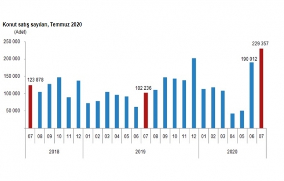 Türkiye genelinde konut satışları 2020 Temmuz ayında bir önceki yılın aynı ayına göre yüzde 124,3 artarak 229 bin 357 oldu. Konut satışlarında, İstanbul 39 bin 432 konut satışı ve yüzde 17,2 ile en yüksek paya sahip oldu. Satış sayılarına göre İstanbul'u, 26 bin 885 konut satışı ve yüzde 11,7 pay ile Ankara, 15 bin 614 konut satışı ve yüzde 6,8 pay ile İzmir izledi. Konut satış sayısının en düşük olduğu iller sırasıyla 19 konut ile Hakkari, 30 konut ile Ardahan ve 74 konut ile Şırnak oldu.