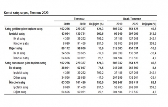 Ocak-Temmuz döneminde 854 bin 126 konut satışı gerçekleşerek, bir önceki yılın aynı dönemine göre yüzde 40,5 artış gösterdi. Ocak-Temmuz döneminde ipotekli konut satışı yüzde 313,9 artarak 397 bin 95, diğer satış türlerinde ise yüzde 10,8 azalarak 457 bin 31 oldu. Bu dönemde ilk defa satılan konutlar yüzde 8,4 artarak 265 bin 709 oldu. İkinci el konut satışları da yüzde 62,1 artarak 588 bin 417 olarak gerçekleşti.