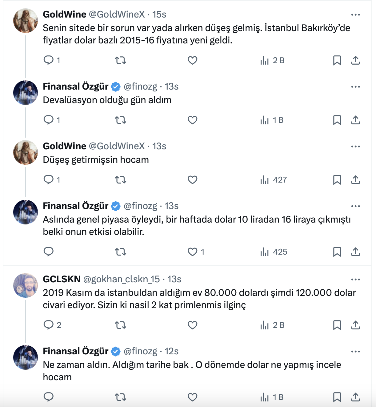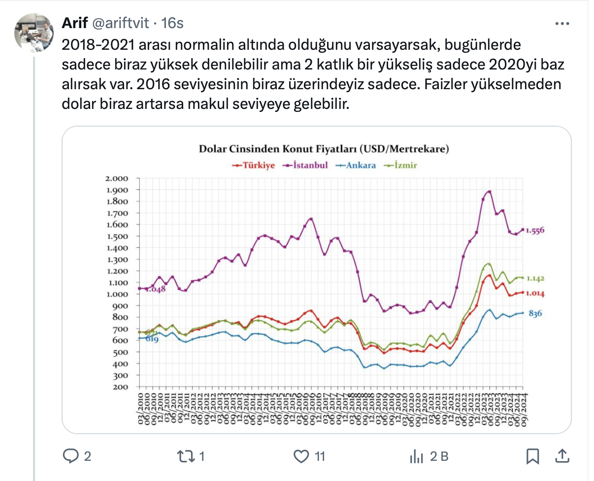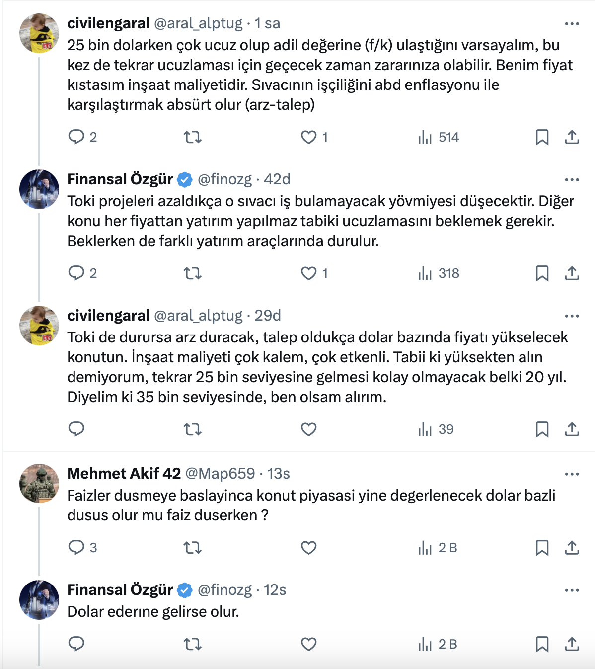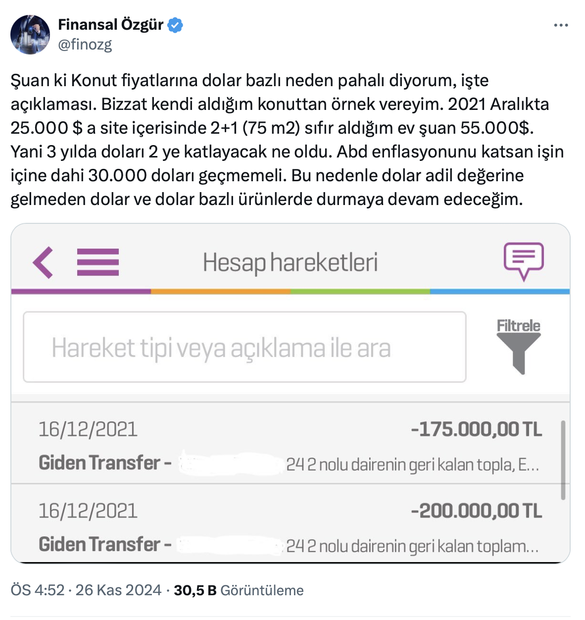 14,3 bin takipçili Finansal Özgür resmi sosyal medya hesabı https://x.com/finozg üzerinden yaptığı paylaşımda 2021 yılının Aralık ayında 25 bin dolar olan evin fiyatının şu an 55 bin dolar olduğunu belirtti.
