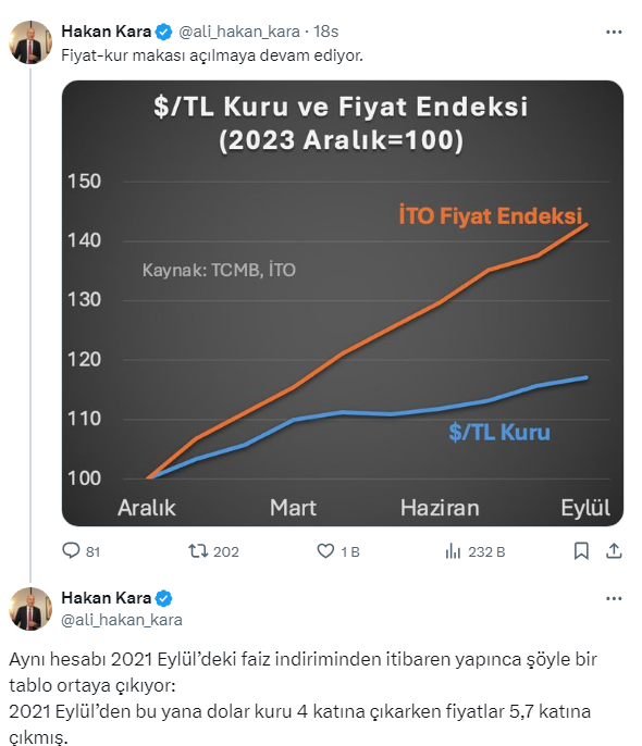 TCMB eski başekonomisti Prof. Dr. Ali Hakan Kara, sosyal medya hesabından, dolar/TL kuru ile fiyatlar arasındaki makasa değindi.