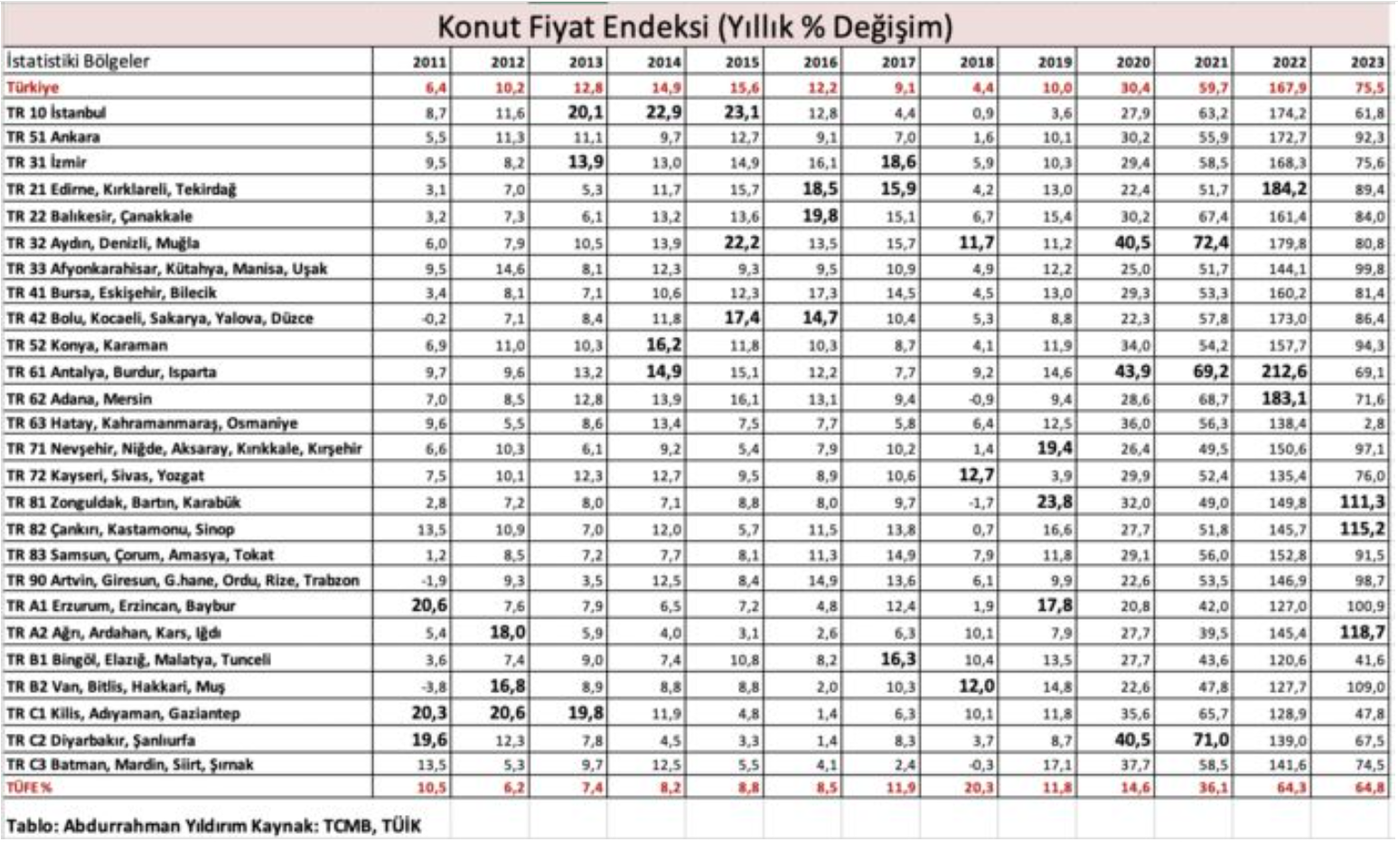 - Türkiye konut fiyatları 2020, 2021 ve 2022 senelerinden sonra muhtemelen 2023'te de dünyanın en yüksek fiyat artışını yaşayan ülkesi olmuş olacak.