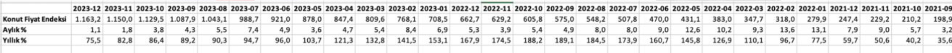 - Buna karşılık fiyat artışları hala sürüyor ancak ama hız keserek. 2022 yılının Haziran ayında senelik yüzde 160.2 artış gösteren konut fiyatları 2023 yılının Aralık ayında hala yüzde 75.5 yükseliyor.