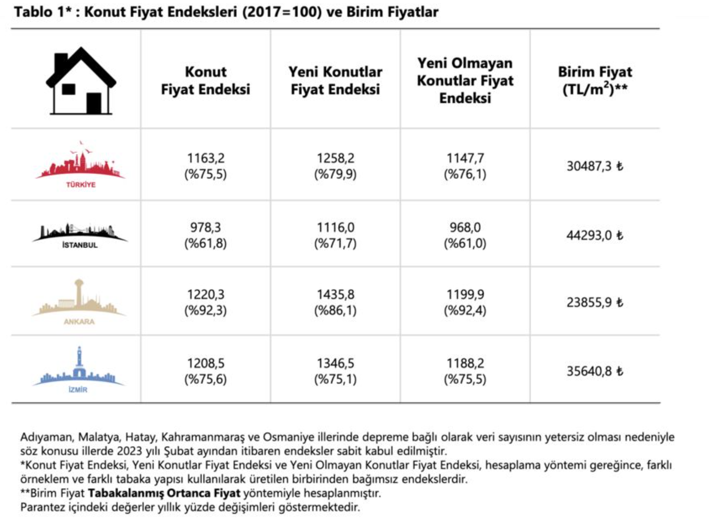 2023 yılı Aralık verileriyle beraber 2023'te konut fiyat artışı netleşti. Ülkemizde konut fiyatları yüzde 75.5 ile hem enflasyonun üzerinde gerçekleşti hem de finansal yatırım araçlarını da geride bıraktı.