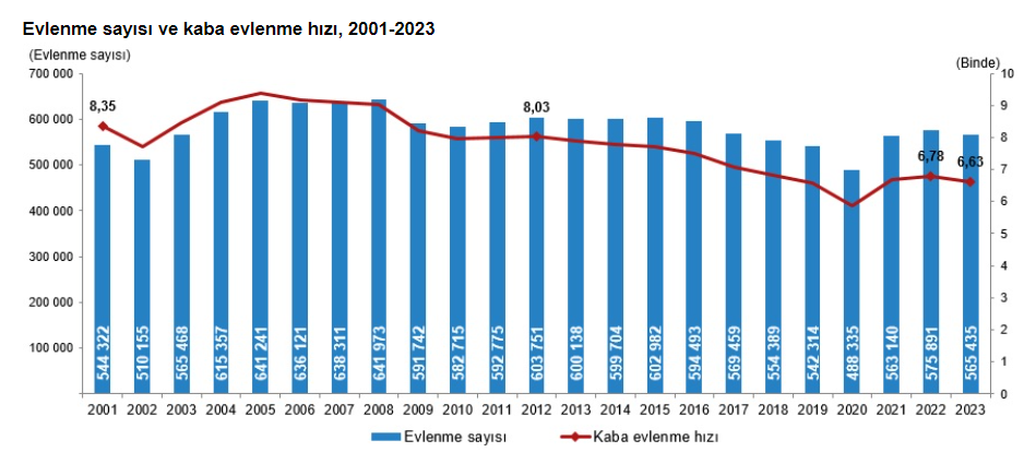 Türkiye İstatistik Kurumu (TÜİK) merakla beklenen 2023 yılı evlenme ve boşanma istatistiklerini resmen açıkladı. TÜİK tarafından açıklanan rakamlara göre evlenen çiftlerin sayısı 2022'de 575 bin 891 şeklinde iken 2023'te 565 bin 435 şeklinde oldu. Bin nüfus başına düşen evlenme sayısını ifade eden kaba evlenme hızı 2023'te binde 6,63 şeklinde gerçekleşti.