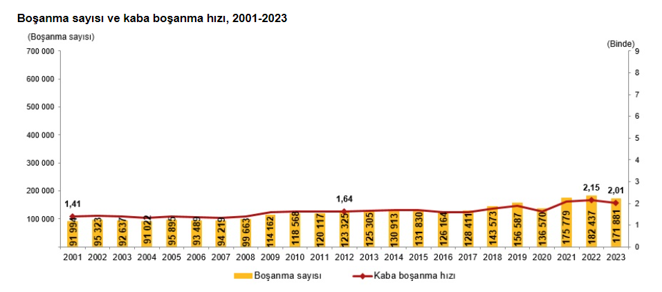 Türkiye İstatistik Kurumu'nun açıkladığı rakamlara göre boşanan çiftlerin sayısı 2022'de 182 bin 437 şeklinde iken 2023'te 171 bin 881 şeklinde oldu. Ayrıca bin nüfus başına düşen boşanma sayısını ifade eden kaba boşanma hızı ise 2023'te binde 2,01 şeklinde gerçekleşti.