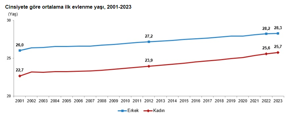 Senelere göre ortalama ilk evlenme yaşına bakıldığı zaman, her iki cinsiyette de ilk evlenme yaşının arttığı kaydedildi. Paylaşılan detaylara göre ortalama ilk evlenme yaşı 2023'te erkeklerde 28,3 iken kadınlarda 25,7 şeklinde oldu. Erkek ile kadın arasındaki ortalama ilk evlenme yaş farkı da 2,6 yaş şeklinde gerçekleşti.