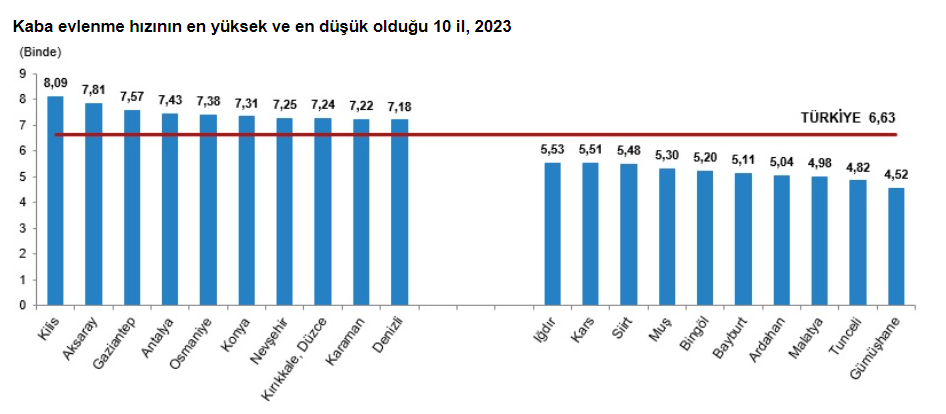 Açıklanan detaylara göre kaba evlenme hızının 2023'te en yüksek olduğu şehir, binde 8,09 ile Kilis olurken, Kilis'i binde 7,81 ile Aksaray, binde 7,57 ile Gaziantep takip etti. Ayrıca kaba evlenme hızının en düşük olduğu şehir de binde 4,52 ile Gümüşhane olarak açıklandı. Gümüşhane'yi binde 4,82 ile Tunceli, binde 4,98 ile Malatya takip etti.