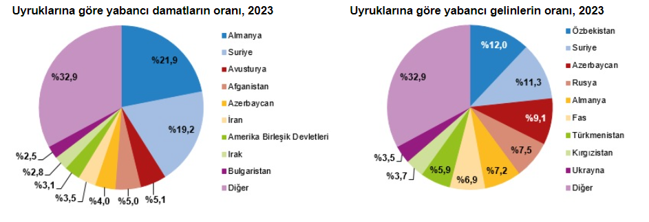 Toplam evlenmeler içerisinde yabancı kişiler ile evlenmeler masaya yatırıldığında yabancı damatların sayısı 202'te 6 bin 345 olup toplam damatların yüzde 1,1'ini oluştururken yabancı gelinlerin sayısı ise 31 bin 29 olup toplam gelinlerin yüzde 5,5'lik bölümünü oluşturdu.