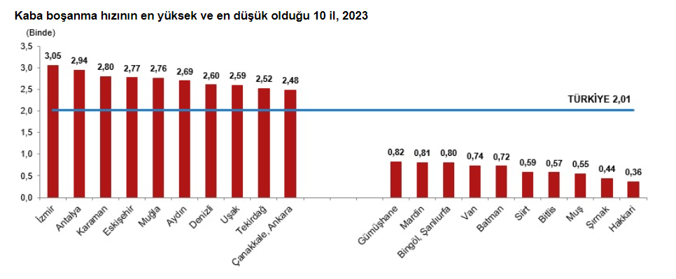 TÜİK tarafından açıklanan resmi rakamlara göre kaba boşanma hızının 2023'te en yüksek olduğu şehir binde 3,05 ile İzmir oldu. İzmir'i binde 2,94 ile Antalya, binde 2,80 ile Karaman takip etti. Ayrıca kaba boşanma hızının en düşük olduğu şehir de binde 0,36 ile Hakkari oldu. Hakkari'yi binde 0,44 ile Şırnak, binde 0,55 ile Muş takip etti.