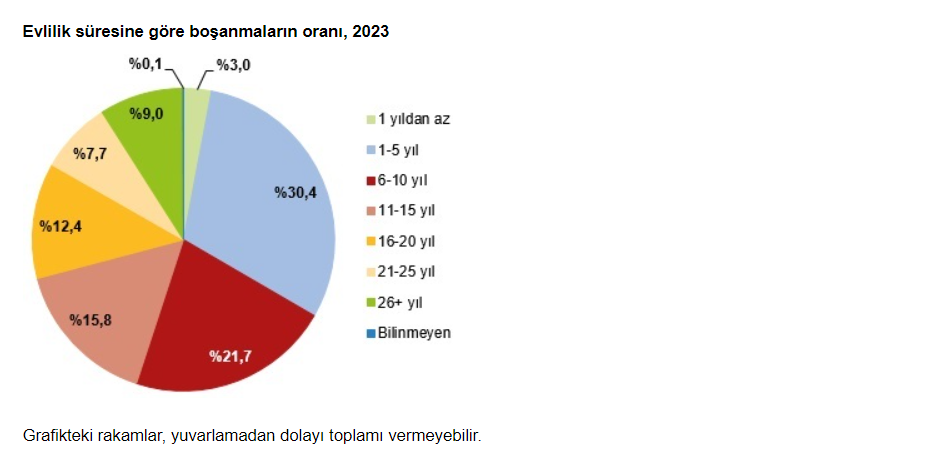 Evlilik süresine göre boşanmalar masaya yatırıldığında 2023'te gerçekleşen boşanmaların yüzde 33,4'lük bölümü evliliğin ilk 5 senesi, yüzde 21,7'lik bölümü de evliliğin 6-10 senesi içinde gerçekleşti.
