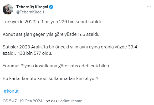 Dün TÜİK 2023 konut satışı rakamlarını açıkladı. Buna göre Türkiye'de 2023'te 1 milyon 226 bin konut satıldı. Konut satışları geçen yıla göre yüzde 17.5 azaldı. Satışlar 2023 Aralık ayında bir önceki yılın aynı ayına oranla yüzde 33.4 düşüşle, 138 bin 577 oldu. TÜİK tarafından açıklanan konut satışı rakamlarını değerlendiren Türkiye'nin 1 numaralı emlak ve konut editörü Tebernüş Kireçci piyasa koşullarına göre bu satış adetlerinin çok bile olduğunu belirterek ''Bu kadar konutu kredi kullanmadan kim alıyor?'' diye sordu. İşte sosyal medya hesabı X'ten yaptığı o paylaşım ve takipçilerden gelen yorumlar...