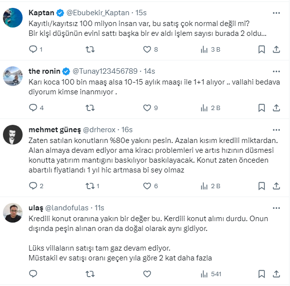 ulaş @landofulas: ''Kredili konut oranına yakın bir değer bu. Kerdili konut alımı durdu. Onun dışında peşin alınan oran da doğal olarak aynı gidiyor. Lüks villaların satışı tam gaz devam ediyor. Müstakil ev satışı oranı geçen yıla göre 2 kat daha fazla.''