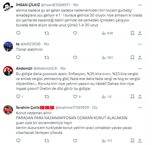 Akdenizli @AkdenizliCA: ''Bu gidişle daha çoooook azalır. Enflasyon, %25 kira sınırı, %23 kira vergisi ve emlak vergisi yetmezmiş gibi; fazla eve daha fazla vergi ve boş ev vergisi söylentileri... Konuta kim niye yatırım yapsın bu hâlde? Dahası kim niye inşaat çıksın? Üretim de dibi görür bu gidişle.''