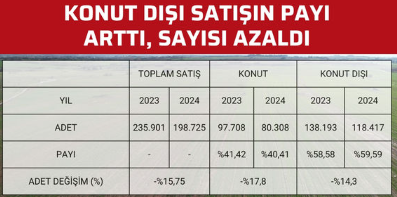 2024 yılında toplam satış 198 bin 725'e kadar inerken söz konusu bu düşüşten hem konut hem konut dışı satışlar etkilendi. Konut satışları, yüzde 17,8 oranında düşüş gösterirken, konut dışı satış da yüzde 14,31 indi.