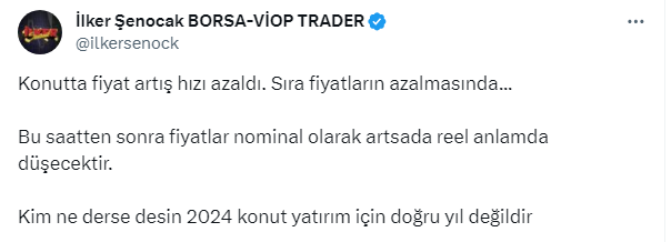 Emlak piyasasında durgunluk devam ederken, konut fiyatlarında da artış hızı yavaşladı. Broker İlker Şenocak, x sosyal medya hesabından yaptığı paylaşımında, yatırımcılar için “2024 yılı konut almak için doğru yıl mı?” sorusunun cevabını verdi.