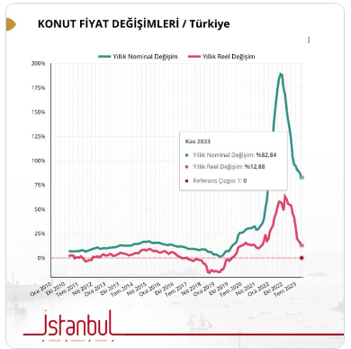 Konut fiyatları yıllık bazda yüzde 82,8 artarken, kasım ayındaki reel yükseliş ise yüzde 12.4 oldu. Bu artış geçen yılın gerisinde kaldı. Konuttaki fiyat artış hızının azaldığını söyleyen broker İlker Şenocak, twitter.com/ilkersenock X sosyal medya hesabından yaptığı paylaşımda, fiyatların da düşüşe geçeceğini belirterek, 2024’ün konut yatırımı için doğru yıl olmadığını ifade etti.