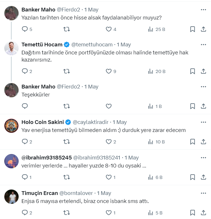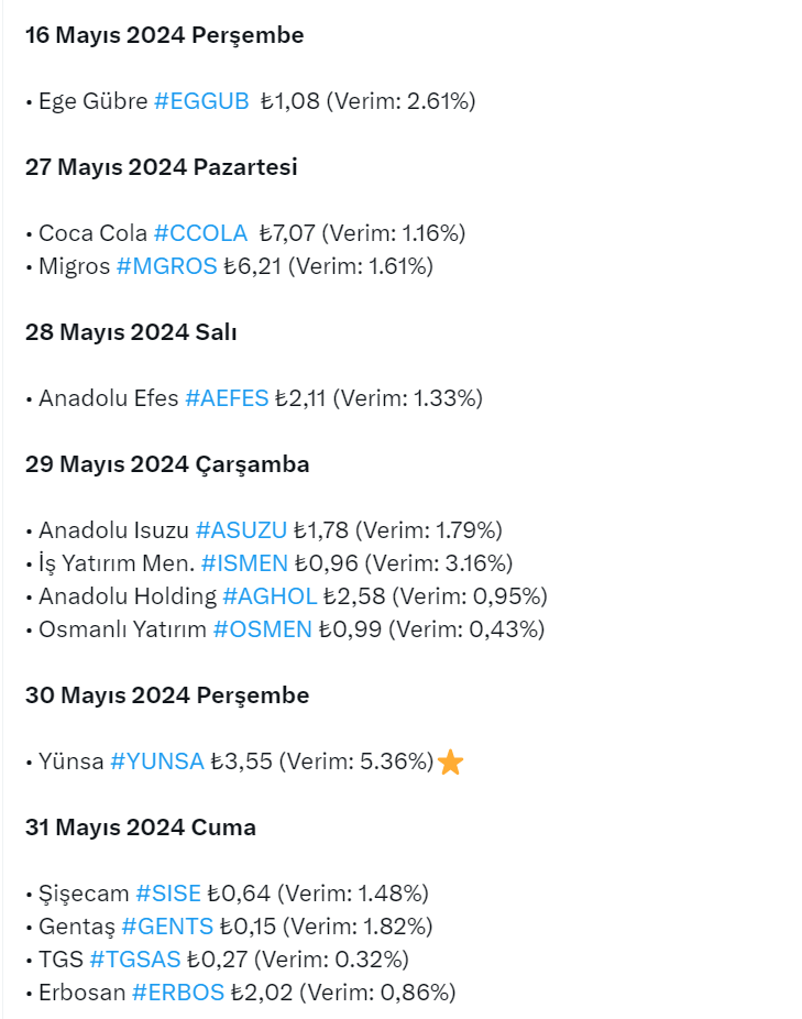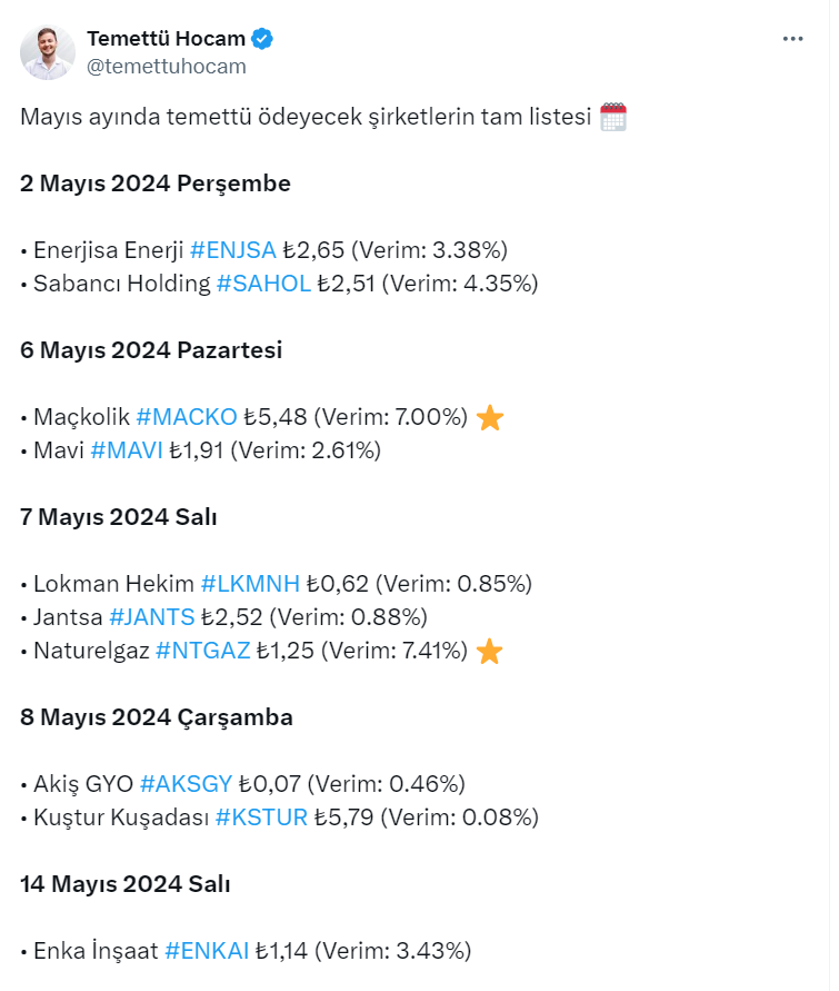 Temettü Hocam resmi X hesabı https://twitter.com/temettuhocam üzerinden yaptığı paylaşımda Mayıs ayında temettü ödeyecek şirketlerin tam listesini yayınladı.