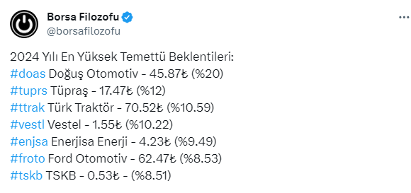 Yaptığı paylaşımlarla dikkat çeken Borsa Filozofu resmi sosyal medya hesabı https://twitter.com/borsafilozofu üzerinden 2024 yılı en yüksek temettü beklentilerini açıkladı.