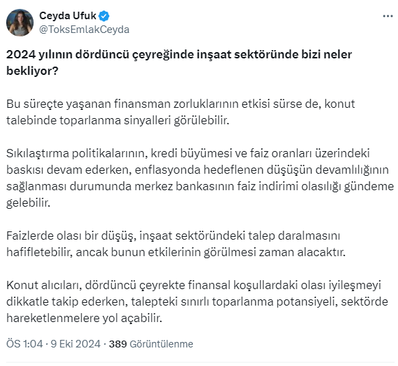 Gayrimenkul uzmanı Ceyda Ufuk, 2024 yılının dördüncü çeyreğinde inşaat sektörünü bekleyen gelişmeleri sosyal medya hesabından açıkladı. Peki inşaat sektörünü neler bekliyor? Konut fiyatları ne olacak? İşte Ufuk'un o açıklaması...