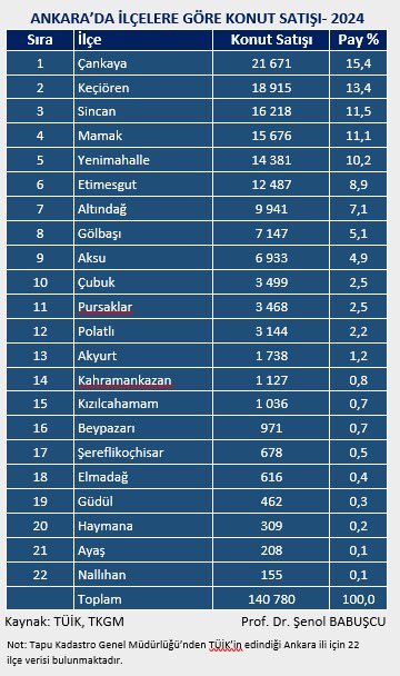 Şenol Babuşcu, söz konusu paylaşımında Ankara'da ilçelere göre konut satışı rakamlarına yer verdi ve şu ifadeleri kullandı: