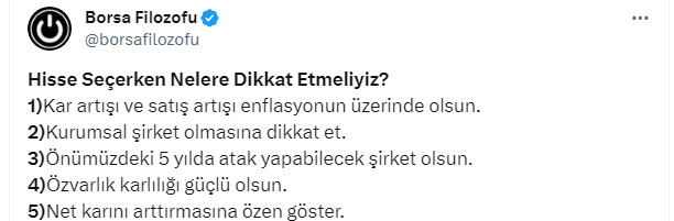Borsa İstanbul yerli ve yabancı yatırımcıların yeniden ilgisini çekmeye başlarken 221 bin takipçili Borsa Filozofu yatırımcılar için twitter.com/borsafilozofu X sosyal medya hesabından bir paylaşım yaptı. Borsa Filozofu hisse alırken dikkat edilmesi gerekenleri 20 maddede sıraladı.