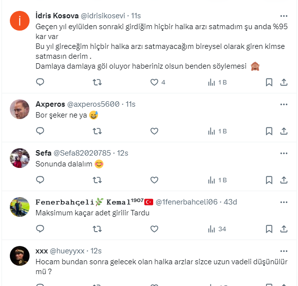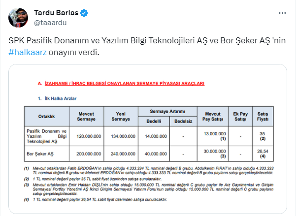 Borsa Temel Analisti Tardu Barlas yatırımcının uzun süredir beklediği SPK’nın halka halka arz onayını twitter.com/taaardu X sosyal medya hesabından paylaştı. Barlas’ın takipçilerinden bazıları halka arz için heyecanlanırken kimileri de tedbirli davrandı.