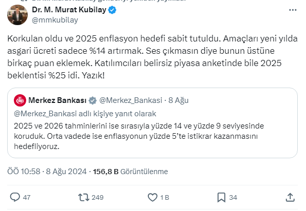 Korkulan oldu ve 2025 enflasyon hedefi sabit tutuldu. Amaçları yeni yılda asgari ücreti sadece %14 artırmak. Ses çıkmasın diye bunun üstüne birkaç puan eklemek. Katılımcıları belirsiz piyasa anketinde bile 2025 beklentisi %25 idi. Yazık!