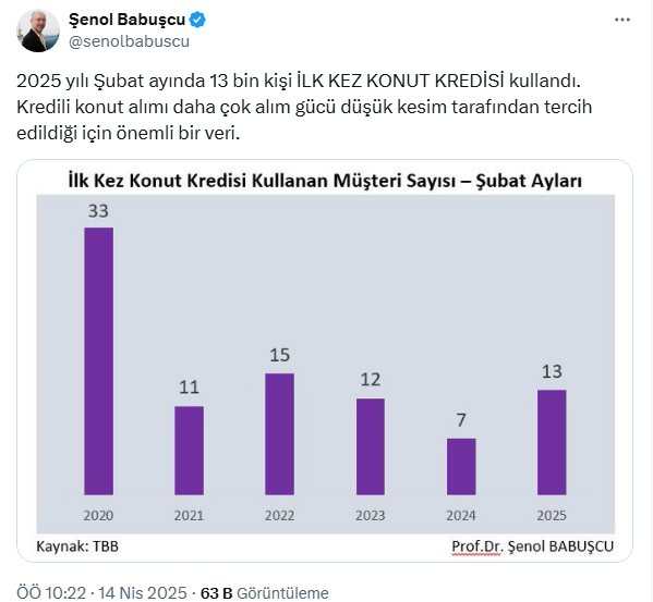 Ekonomist Şenol Babuşçu konut kredisi ile ilgili önemli değerlendirmelerde bulundu. Babuşçu, şubat ayında 13 bin kişinin ilk kez kredi ile konut aldığını söyleyerek ''Kredili konut alımı daha çok alım gücü düşük kesim tarafından tercih edildiği için önemli bir veri.'' dedi.