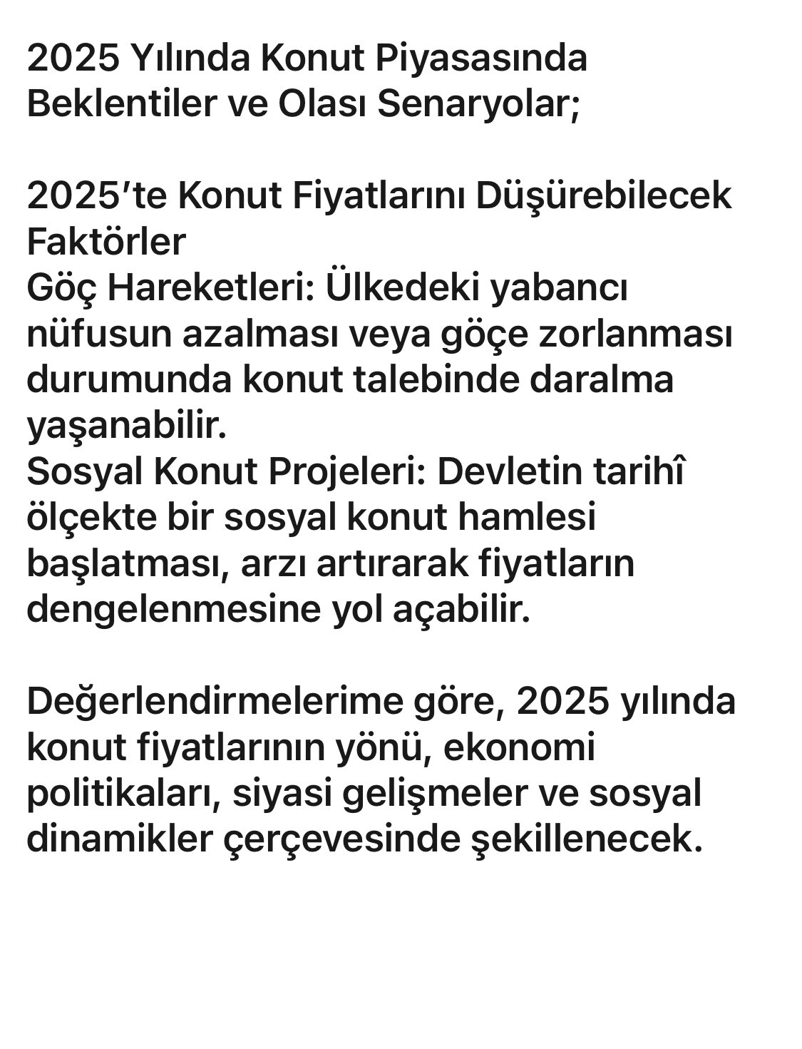Değerlendirmelerime göre, 2025 yılında konut fiyatlarının yönü, ekonomi politikaları, siyasi gelişmeler ve sosyal dinamikler çerçevesinde çekillenecek.