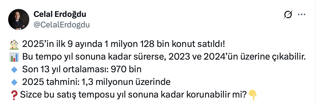 Şehir Plancısı ve Gayrimenkul Değerleme Uzmanı Celal Erdoğdu yaptığı paylaşımda 2025 yılının ilk 9 ayında 1 milyon 128 bin konut satıldığını belirtti.