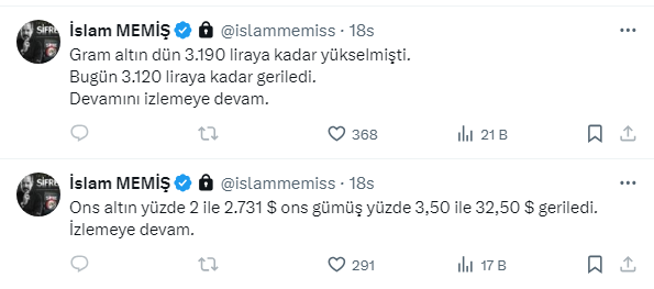 İslam Memiş, sosyal medya hesabından altın ve gümüş fiyatlarının düştüğünü açıkladı.