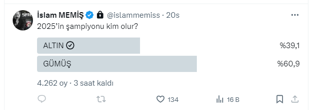 Anketin bitmesine son üç saat kalırken 4 bin 262 kişi oy kullandı. Oylara göre yüzde 60,9'u gümüşün, yüzde 39,1'lik kısım ise altının şampiyon olacağını söyledi.