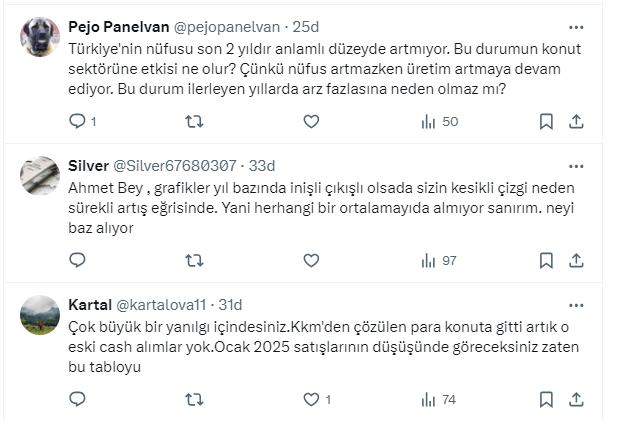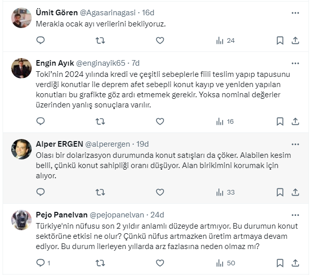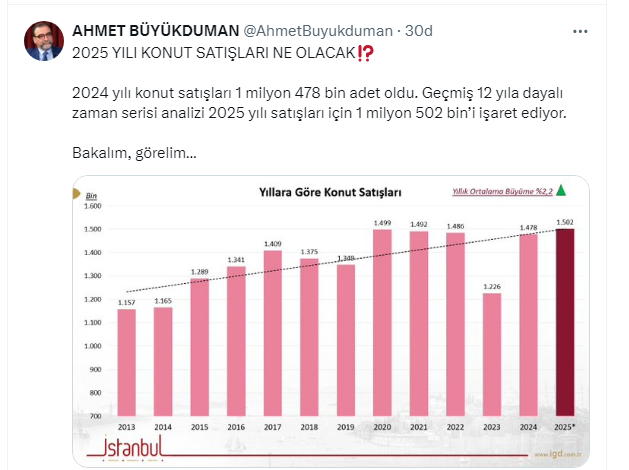 “2024 yılı konut satışları 1 milyon 478 bin adet oldu. Geçmiş 12 yıla dayalı zaman serisi analizi 2025 yılı satışları için 1 milyon 502 bin’i işaret ediyor. Bakalım, görelim” dedi.