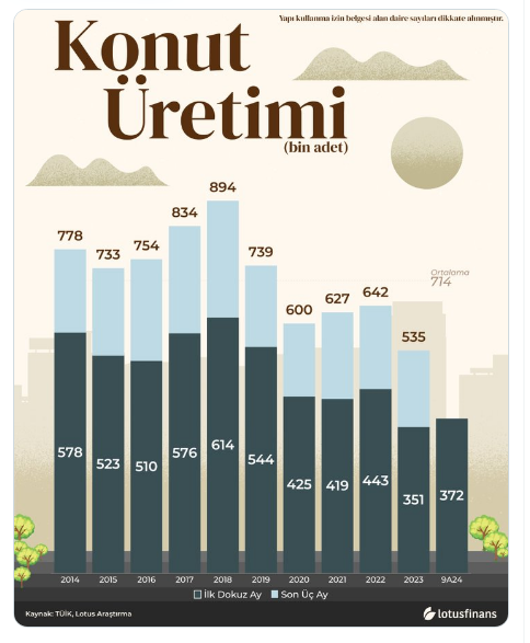 2018 yılında 900 bin adete yaklaşan ve son on yılın ortalaması 714 bin adet olan yeni daire sayısının, geçen yıl 535 bin seviyelerine kadar düştüğü ve bu yıl da benzer seviyelerde kaldığı görülüyor.