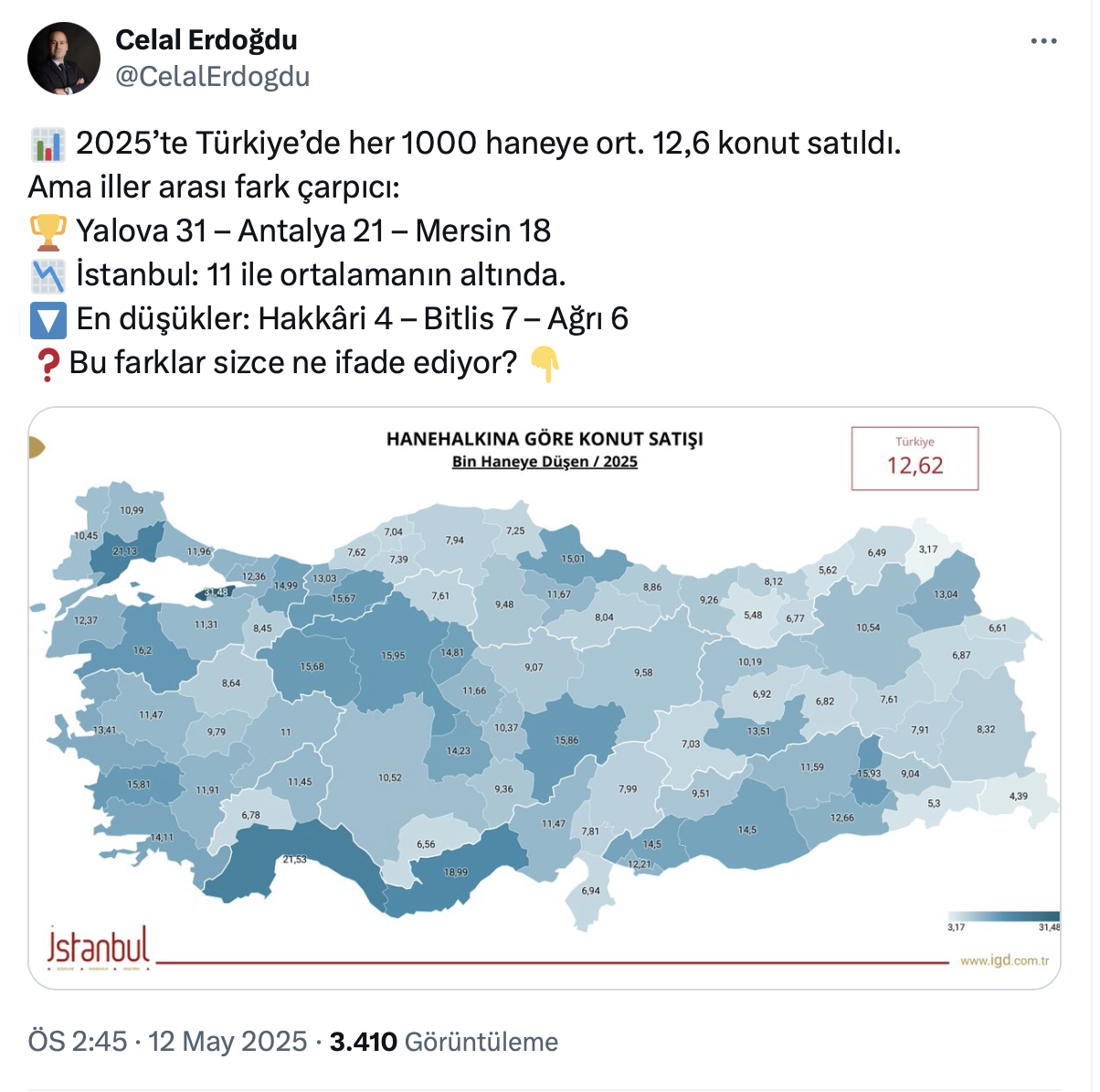 Celal Erdoğdu sosyal medya hesabı üzerinden yaptığı paylaşımda 2025’te Türkiye’de her bin haneye ortalama 12,6 konut satıldığını belirtti.