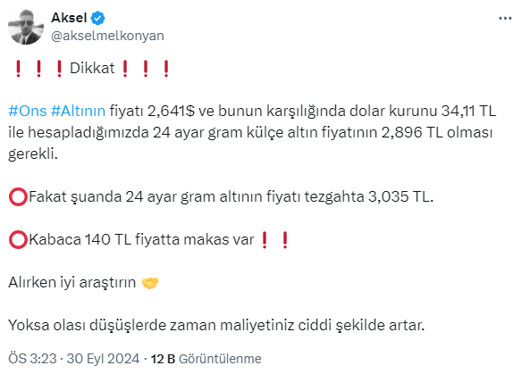 Aksel, 24 ayar gram altını tezgahta 3035 liradan satılldığını, kabaca, aradaki makasın 140 TL olduğunu belirtti. ''Altın alırken iyi araştırın'' diyen uzman isim, yatırımcıları sosyal medya hesabından uyardı.