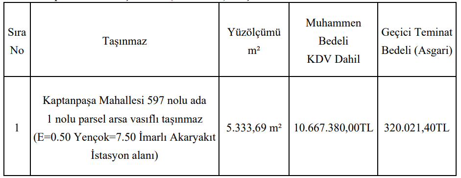 teklif usulü ile satışı yapılacaktır. İhaleye ilişkin ayrıntılı bilgiler aşağıda yer almaktadır.