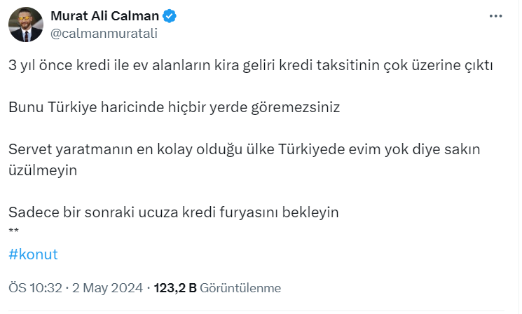 Murat Ali Calman ayrıca paylaşımında şu ifadeleri kullandı: "3 yıl önce kredi ile ev alanların kira geliri kredi taksitinin çok üzerine çıktı. Bunu Türkiye haricinde hiçbir yerde göremezsiniz. Servet yaratmanın en kolay olduğu ülke Türkiye'de evim yok diye sakın üzülmeyin. Sadece bir sonraki ucuza kredi furyasını bekleyin."