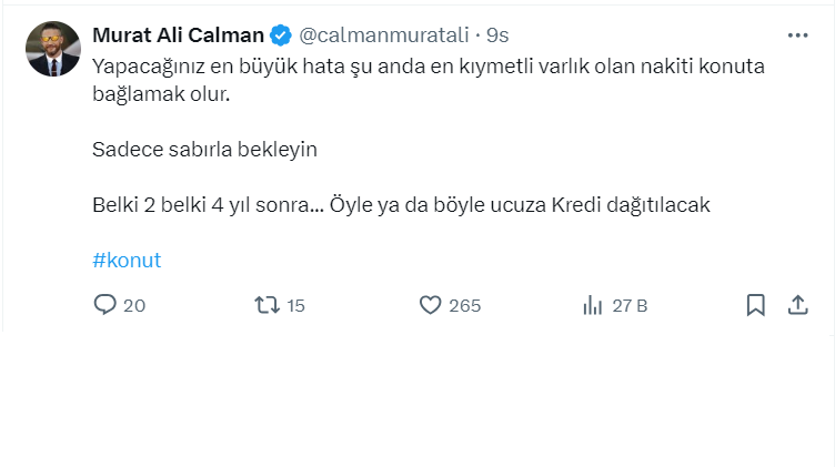 Ekonomistlerden ve sektör temsilcilerinden konut sektörü ile ilgili çarpıcı yorumlar peş peşe gelirken, Kripto fenomeni Murat Ali Calman da resmi X hesabı https://twitter.com/calmanmuratali üzerinden bir paylaşım yaptı.
