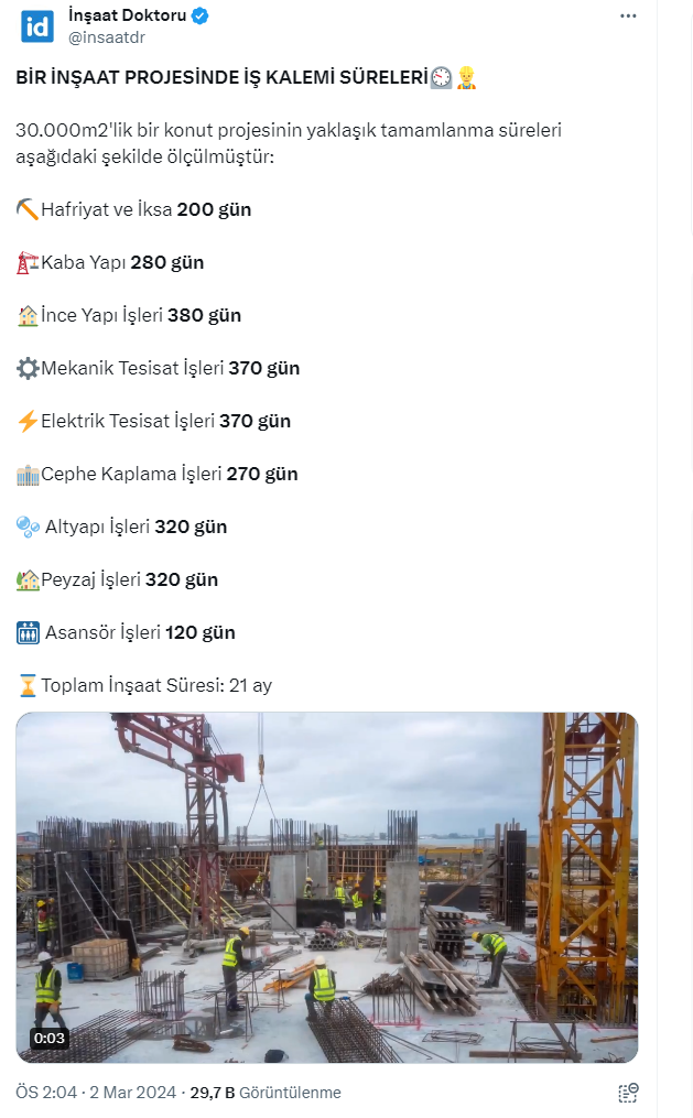 İnşaat Doktoru resmi X hesabı https://twitter.com/insaatdr üzerinden bu süreleri paylaştı. Peki 30 bin metrekarelik bir konut projesinin yaklaşık tamamlanma süreleri ne kadar?