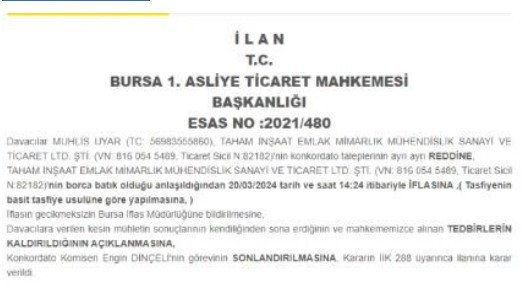 Bursa'nın tanınmış şirketlerinden biri olan Taham, borçlarını yapılandırmak için konkordato talep etmişti. Şirket, verilen sürenin tekrar uzatılması için mahkemeye başvurdu. Ekonomim'de yer alan habere göre, ancak şirketin konkordato süresinin uzatılması talebi Bursa 1. Asliye Ticaret Mahkemesi tarafından reddedildi. Mahkeme Taham İnşaat'ın iflasına karar verildi.