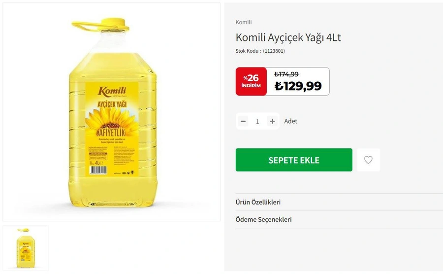 Komili Ayçiçek Yağı'nı 4 litrelik ambalajında 174,99 TL yerine yalnızca 129,99 TL'ye satışa sunuyor.
