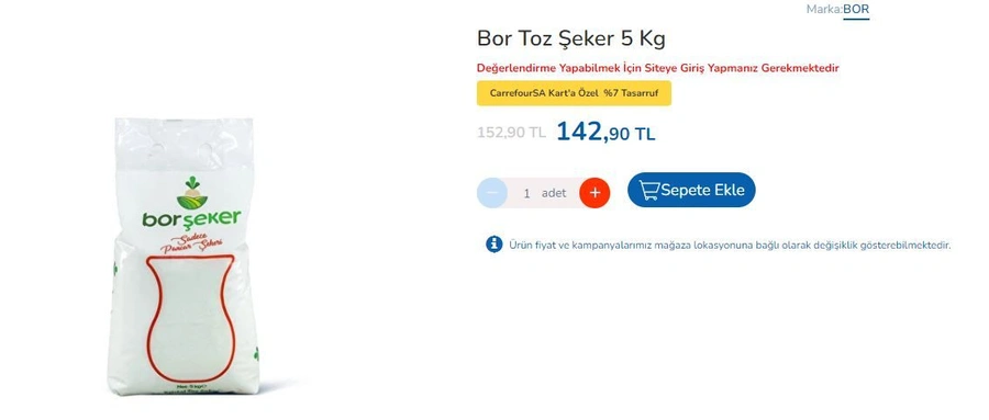 CarrefourSA'nın kampanyası kapsamında Bor Toz Şeker 5 Kg, 152,90 TL olan fiyatı, şimdi sadece 142,90 TL'ye kadar düşürüldü. Bu indirim, toz şeker ihtiyacı olanlar için önemli bir tasarruf fırsatı sunuyor.