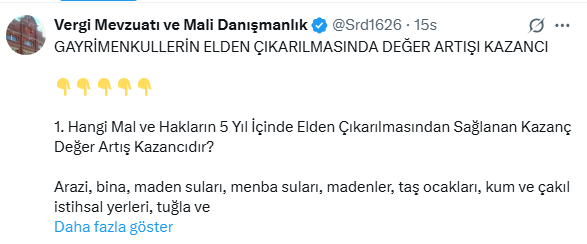 Vergi Mevsuatı ve Mali Danışmalık sosyal medya hesabı X'ten hangi mal ve hakların 5 yıl içinde elden çıkarılmasından sağlanan kazanç değer artış kazancı olduğu 7 maddede şu şekilde açıkladı;